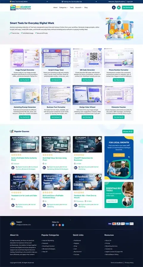 The platform provides a pre-built digital academy framework. You simply customize basic details such as branding, product names, and descriptions—no website building or coding required.